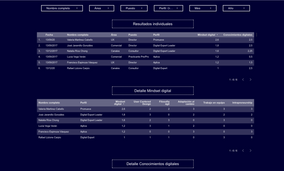 The results obtained per dimension are captured on a matrix with 4 quadrants of digital maturity. The final score per employee is accompanied by the profile obtained and an automated conclusion that indicates the areas with low items in which the employee should focus, and actions to improve.
